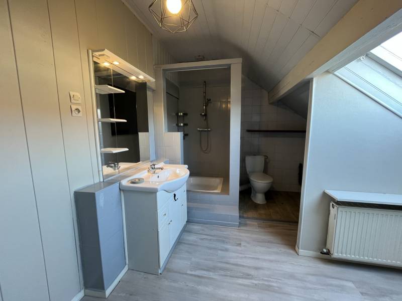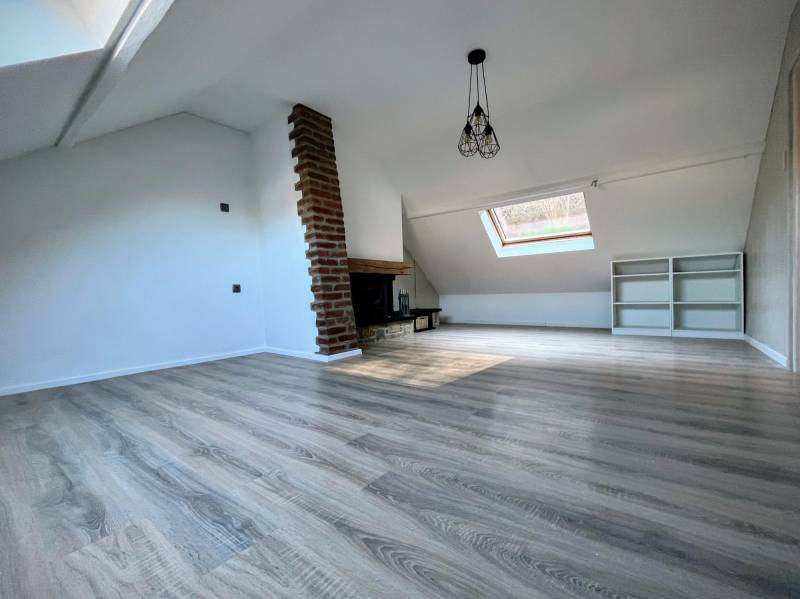 Ce duplex se trouve dans une maison de caractère en bordure de forêt, divisée en deux logements. Il se compose d'une entrée, de deux chambres spacieuses, d'un séjour, d'une cuisine équipée neuve, d'une grande pièce avec cheminée au bois, de deux salles d'eau, toutes deux équipées de WC.