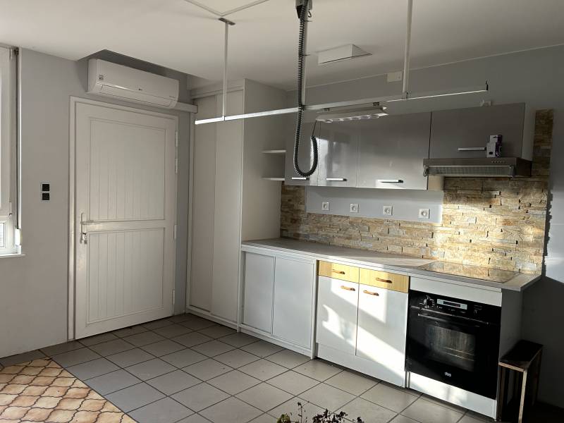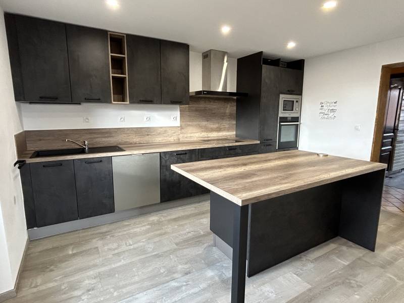 Sur le plain pied surélevé, vous pourrez profiter d'une belle cuisine équipée avec son ilot central ainsi que sa grande pièce à vivre de 37m².